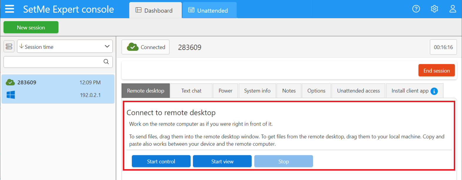Start control: provides you with full control over the remote computer's mouse and keyboard. This allows you to perform all tasks as if you were physically working on the remote computer itself, and transfer data to or from the remote computer. Clipboard sharing between you and the remote computer is enabled by default. It can be temporarily disabled and re-enabled at any moment when working in this mode.